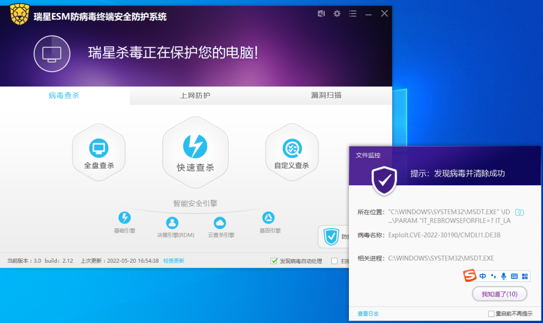 目前,瑞星ESM防病毒终端安全防护系统可拦截相关漏洞利用行为,同时广大用户也可参考微软官方给出的防护建议,直接禁用MSDT URL协议。